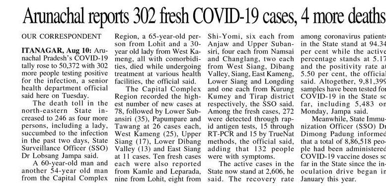 Arunachal logs 302 new cases unicefassam / August 11, 2021 0 0 Read Time:0 Second Share Facebook Twitter Email
