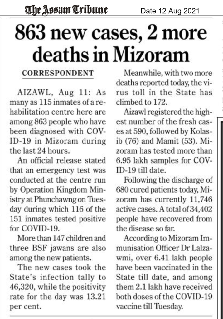 863 new cases, 2 more deaths in Mizoram unicefassam / August 12, 2021 0 0 Read Time:0 Second Share Facebook Twitter Email