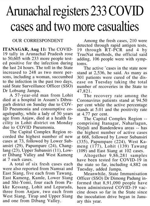 Arunachal registers 233 COVID cases and two more casualties unicefassam / August 12, 2021 0 0 Read Time:0 Second Share Facebook Twitter Email